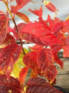 Red is probably the most common fall color. Shrubs like oakleaf hydrangeas, burning bush, chokeberry, itea (sweetspire), and most of the viburnums share red-purple fall color. I particularly like the Viburnum nudum ‘Brandywine’ or ‘Winterthur’ bushes because their foliage is glossy; making the color that much more eye-catching. For trees, dogwoods and sugar maples are probably my favorite. On the farm we have a flowering pink flowering dogwood that is underplanted with pink bleeding hearts and white Solomon’s seal. Those go dormant over the summer and the fall garden features blue aconitum and the yellow foliaged amsonia under the red foliage of the dogwood. I almost like the fall show better.