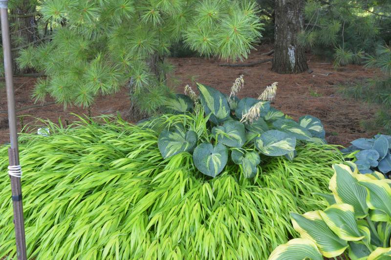 Partial shade grass with delicate, cascading habit. Variegated yellow, white, and green bamboo like blades form dramatic clumps. Very oriental looking. Foliage turns pinkish red in fall. Moist, but well drained, fertile soil in light shade. Plants resent drying out. Slow grower but worth the effort. Zone 5-9. One of the few colorful grasses for partial shade. Plant with hostas, ferns, hellebores, tricyrtis, iris ensata, trillium, and anemone japonica. Native to the moist mountain areas and moist woodland areas of Japan. Tolerates Black Walnut Trees & Air Pollution. Deer Resistant but NOT rabbit resistant.