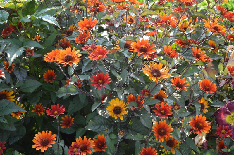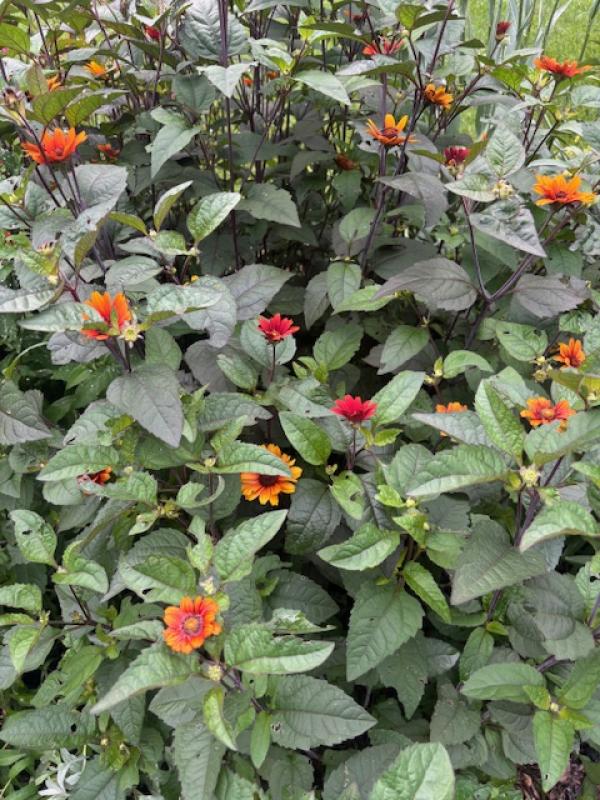 Dark purple foliage with black stems with a sturdy habit. Reliable first year flowering. ‘Bleeding Hearts’ makes a good cut flower. Carefree sun lover that does well in dry soil. Summer staple border plant because of its long blooming time. Heliopsis are native over most of US. Zone 3-9. Put in the sunny border in mass or in the center of an island bed. Plant with daylilies, yarrows, echinacea, liatris, scabiosa, lavender, santolinas, and perovskia.