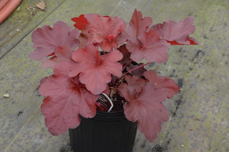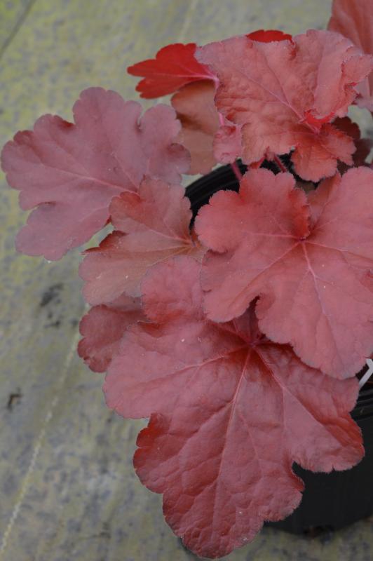 Vigorous grow, fast growing and the reddest leaves ever. The leaves are cut and somewhat ruffled in the spring and fall because of the cooler temperatures. Sun to partial shade in well drained alkaline organic soil. Happiest in bright shade. Zone: 4-9. Excellent plants for the front of the perennial border or among trees and shrubs. Smaller cultivars also good for containers and rock gardens. Deer and Rabbit Resistant, Attracts butterflies and other pollinators.
