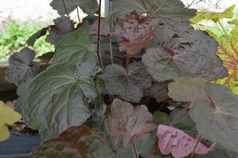 Ivy shaped, deep purple foliage. Mounding plant sending up thin flower stalks. Grown for foliage. Perennial plant of the year 1991. Moist, but well drained, humus rich soil in sun or partial shade. Zone 4-9.
