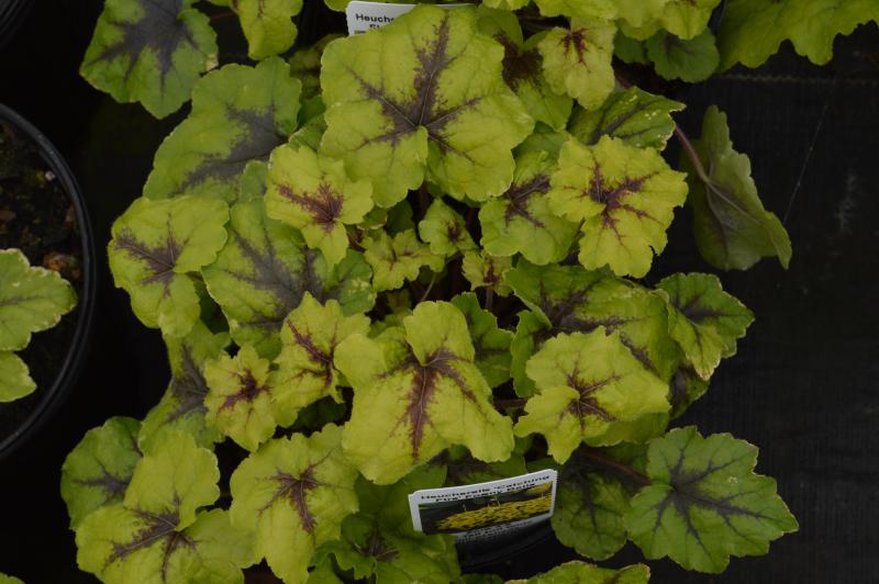 This bright colored foliage plant has vibrant lime green leaves that are rounded. In the middle of each leaf there are flame-shaped markings that flare out. Polished and vigorous. Evergreen. Happiest in moist well drained soil. Plant in an area with filtered sun or afternoon shade. ‘Catching Fire’ is a H villosa hybrid which means that it is more heat and humidity tolerant than Heucherellas without this parentage. Zone 4-9. Plant in combination with ferns, carex, polemonium, and hosta. Good plants for their varied foliage color. Invaluable plants for rockeries, front of borders, and as a groundcover under trees and shrubs. Most effective when planted in large groups. Plant as groundcover under decidous trees and shrubs.