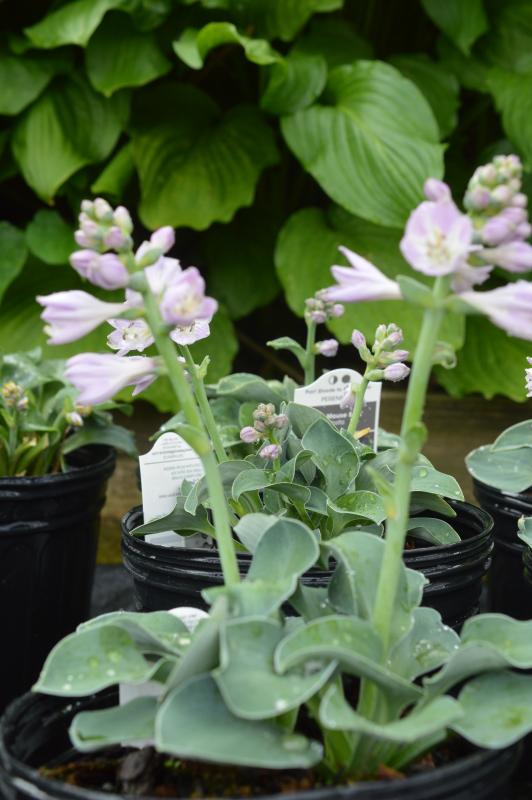 A mini hosta with small round gray green leaves that are thick in substance and cupped. Cute and little with flowers on short scapes. Great mixed container hosta. Easy to grow, long-lived plants. They perform best in a shady spot with evenly moist soil, but will do well in a shady dry spot if well mulched. Zone 3-9. Mini and small hostas are perfect as border plants along paths or when you need to fill a small space in the shade garden. They thrive in dry shade even in competition with tree roots. Great plants for troughs and patio containers placed in shady areas.
