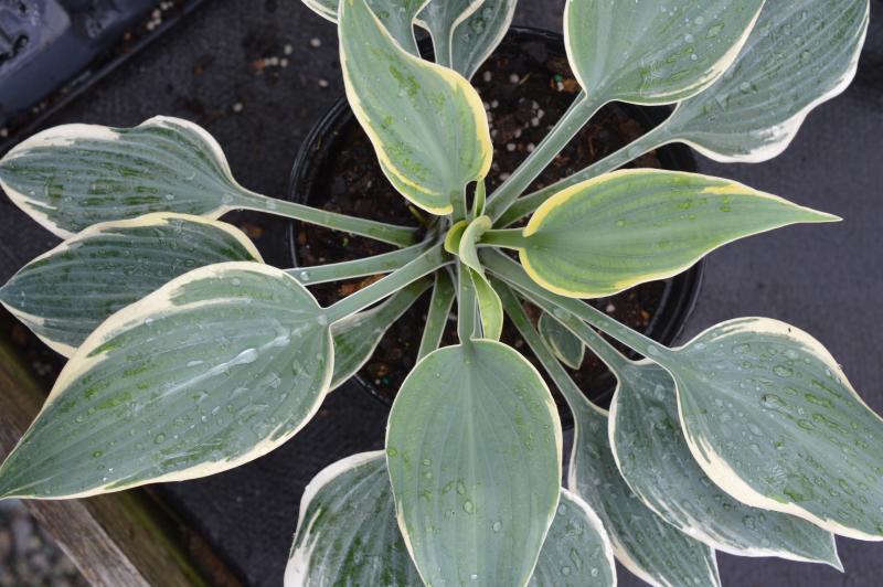 Medium hosta with good growth rate.  Foliage emerges blue with gold margin that changes to a creamy white margin as leaves age.  Plant looks great right up to the first frost. Easy to grow, long-lived plants. They perform best in a shady spot with evenly moist soil, but will do well in a shady dry spot if well mulched. Once established plants keep themselves weed free.  Zone 3-9.