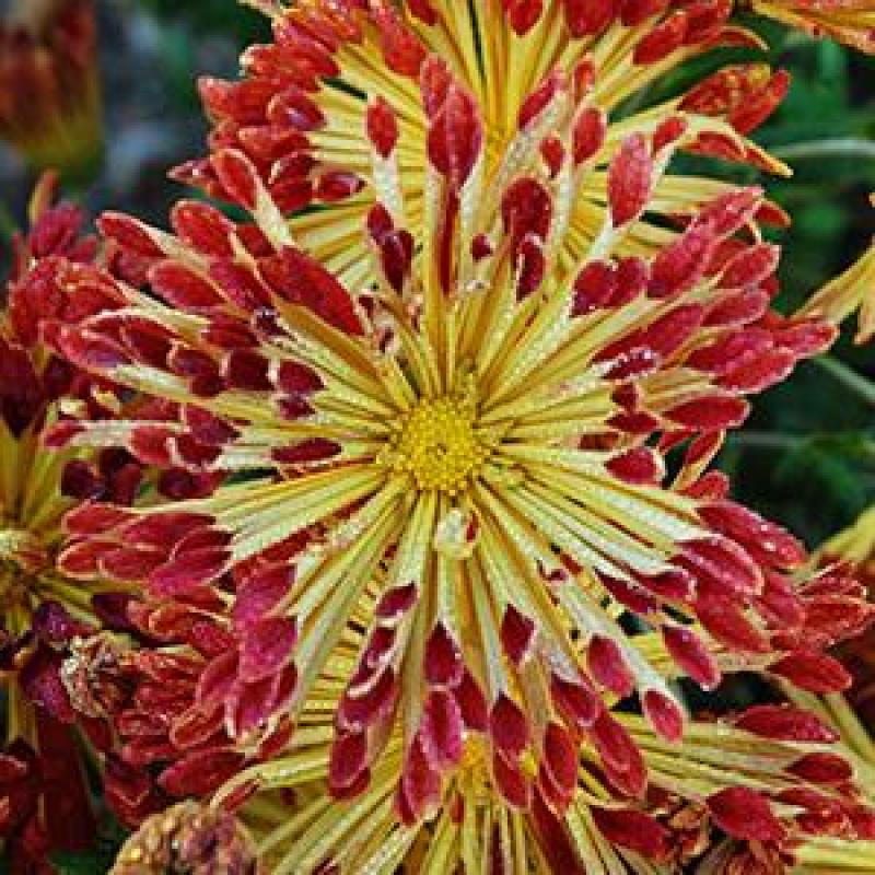 Amazing hardy mum with interesting bicolor spoon-shaped petals.  Resemble lit matches.   Nice and full of flowers in the fall.  Supposedly compact habit, but may be cut back in June to keep shorter. Full sun in average well drained soil . Hardy to zones 5-9. Good fall container plant, fall blooming groundcover, or edging plant. Combine with fall blooming sedum, Russian sage, ornamental grasses, and liatris microcephela or squarosa.