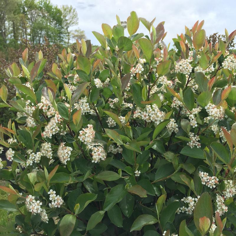 Mid-spring ushers in hundreds of white flowers clustered throughout the dense, glossy-green foliage. In fall, foliage turns a vibrant shades of orange and red. This Aronia does not bear fruit. The ‘Low Scape’ Series is derived from the native Aronia melanocarpa. Great option for borders, containers, and screens. Also works well in landscape or mass plantings, and can be a specimen. With good erosion control consider planting this shrub on slopes or in areas of high erosion. This plant also works well in rain gardens due to its ability withstand prolonged inundated conditions.