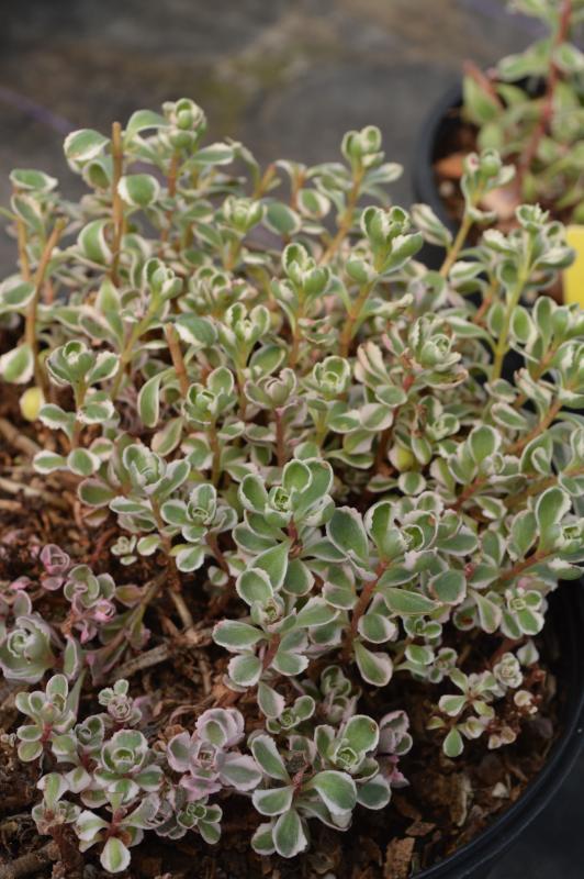 A mat-forming, a low growing succulent with green foliage tinged in white and pink on the edges. Color is darker pink in more sun. Easy to grow in any type of well drained soil in full sun. Back bone of an easy-maintenance sunny bank or rock garden. Low spreading form is great on walls, front of borders, paths, and between stepping stones. Zone 3-9