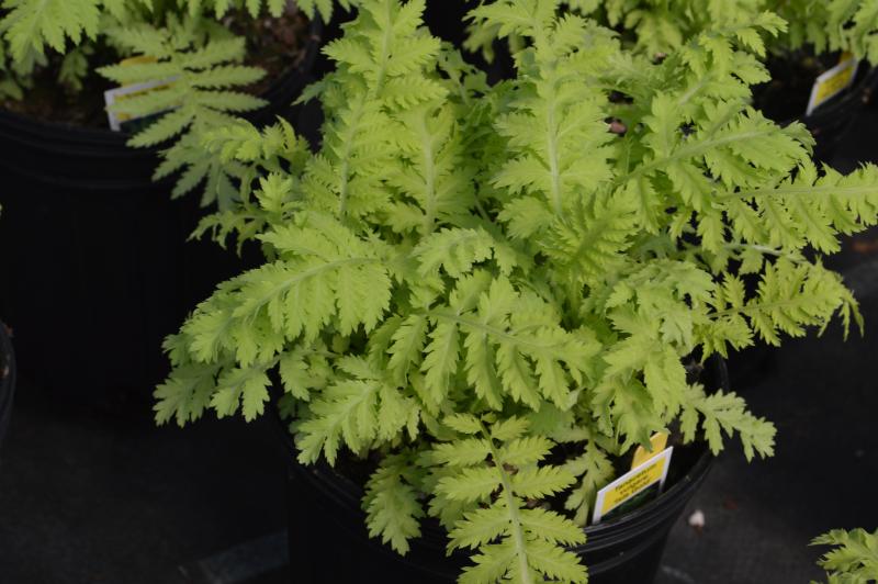 Plant forms a clump of fine, lacy dissected foliage, bright yellow in color making it a great contrast plant next to dark leaved plants. Plant in full sun in well drained soil. Stunning contrast plant with its fine feathery foliage and bright gold color to break up greens in the border. Plant with heliopsis, phlox, knautia, liatris, malva, and verbascum.