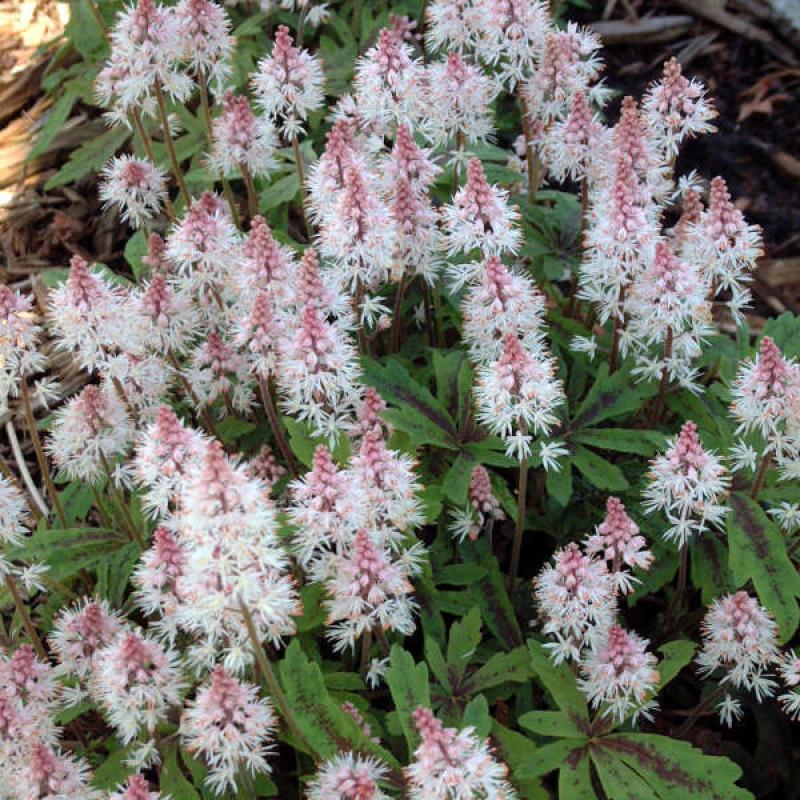 This is a profuse blooming tiarella with very dark pink flowering wands of bottlebrush flowers held above deeply cut freckled green foliage. Thrives in a cool shaded area with well drained soil. One of the best ground covers for partial shade, terrific underplanting for trees and shrubs. Plant along shady paths with spring flowering bulbs, woodland phlox, and hardy geraniums.