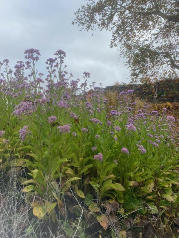 Large leaves emerge in spring looking like a big bunch of green chard and remain a basal clump until late summer. Then 5 foot stems erupt with clusters of sky blue flowers. Clusters of light pink-purple flowers with yellow centers on tall branching stems. Sunny or lightly shaded site in well drained but evenly moist fertile soil that doesnโ€™t remain too wet in winter.  Zone 4-8.  Note:  Plants can spread aggressively by rhizomes in optimum growing conditions.