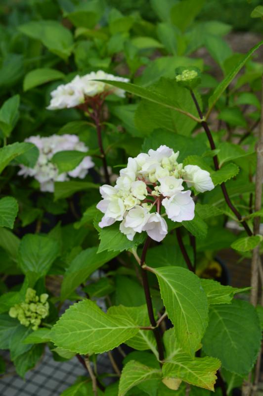 A compact Hydrangea that blooms light pink mophead flowers all summer long, which contrast beautifully against the serrated green leaves and black stems.