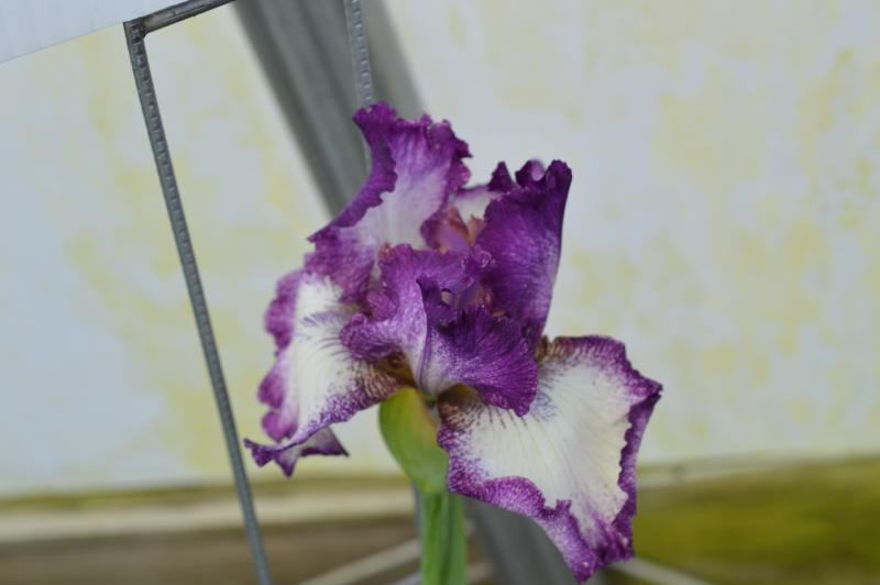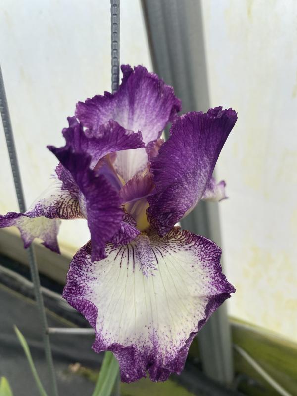 Fans of broad, flat, pointed leaves grow from thick rhizomes that creep along the soil surface. Flower stalks emerge bearing large buds that open to big papery irises with bearded falls. Blooms in June, will re-bloom in august and September. Intense, deep, purple is paired with near white to give this flower striking contrast. Full sun in average to dry, well drained soil that does not remain too wet in winter. Zone 3-8.