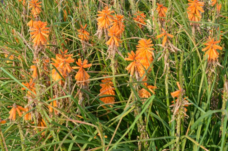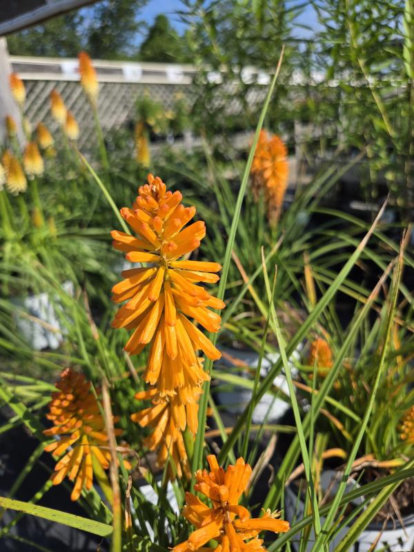 THis red hot poker brings a unique color to your flower beds.It produces spikey brilliant orange blooms over green grass-like foilage.Upright habit.Great for cut flowers.plant with heliopsis,helenium,baptisia,daisy.