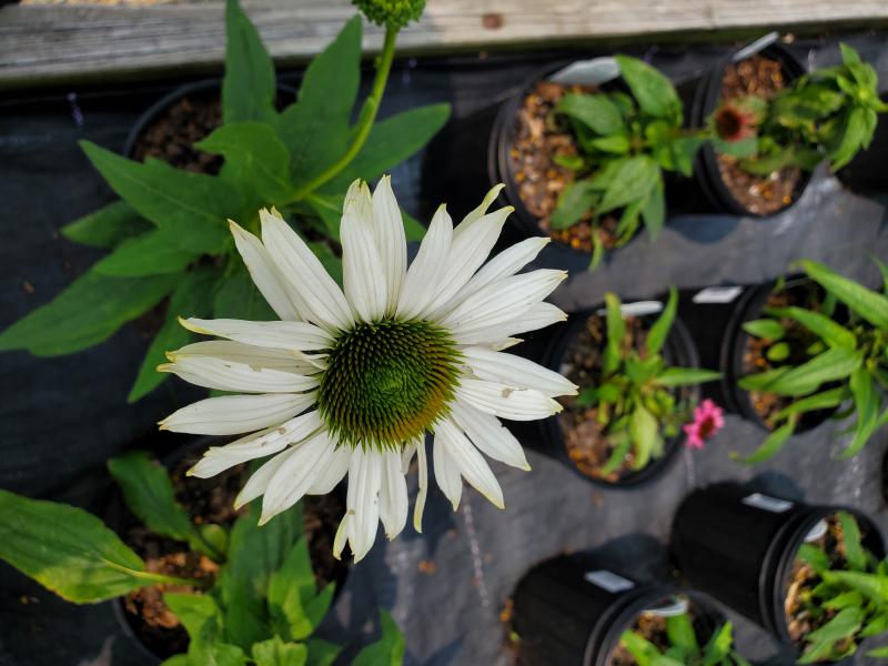 Selected for its impressive sized, fragrant blooms. Stiff stalks with coarse, toothed, dark green leaves hold large, bright white, daisy like blooms with horizontal petals around a spiky central cone. Plants are well branched for lots of blooms. Full sun in well drained medium to dry soil . Tough plants with a deep taproot, tolerant of extended drought. Long flowering plants for the sunny border or wildflower meadow. Plant with heliopsis, yarrow, coreopsis, daylilies, liatris, helianthus, rudbeckia, and ornamental grass.