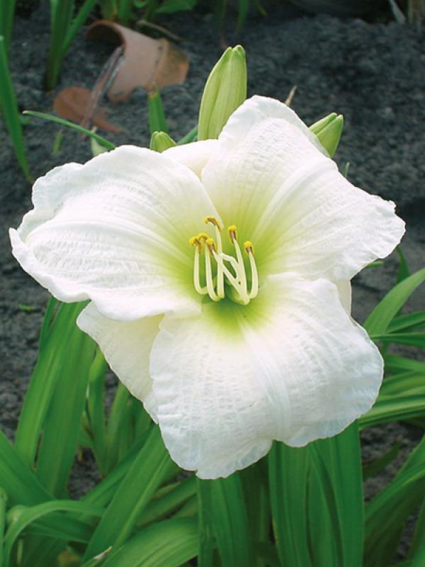 One of the best white flowering daylillies. Tough and adaptable plants in average to rich well drained soil. Plant in full sun or light shade, but they need considerable sun for optimum flowering.  Small stature makes it perfect for container growing or front of border. Favored for large scale and massed plantings because of their adaptability, rapid spread, and extended bloom. Plant in tough spots like banks and swales or in combination with shrubs and trees. Good for foundation plantings or as accent plants for summer bloom in borders.