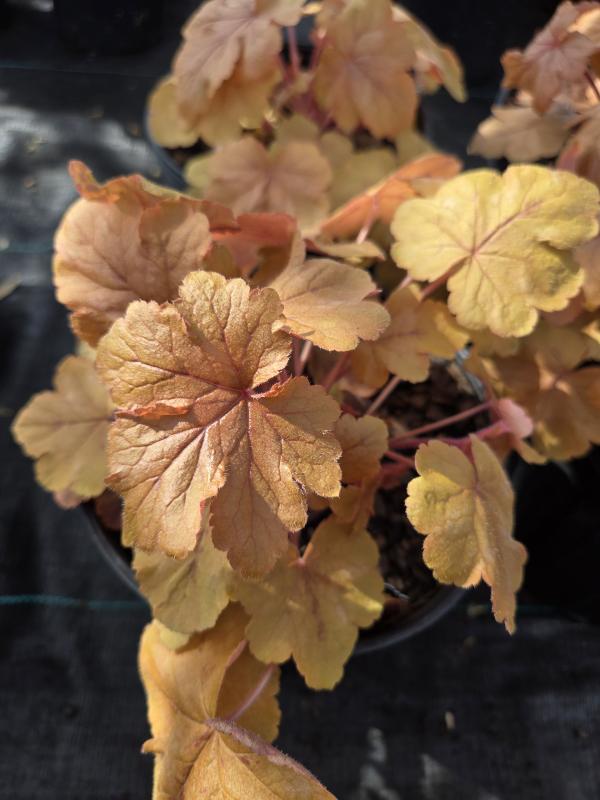Ruby splashed ruffled foliage with red veins. Inter specific hybrid between heuchera and tiarella, foamy flower spike in spring accent the large colorful foliage. Nice fall color. Blooms from summer to early fall. Sprays of tiny creamy white flowers on tall spikes. Moist, humus-rich soil in full sun to partial shade. Requires evenly moist soil.