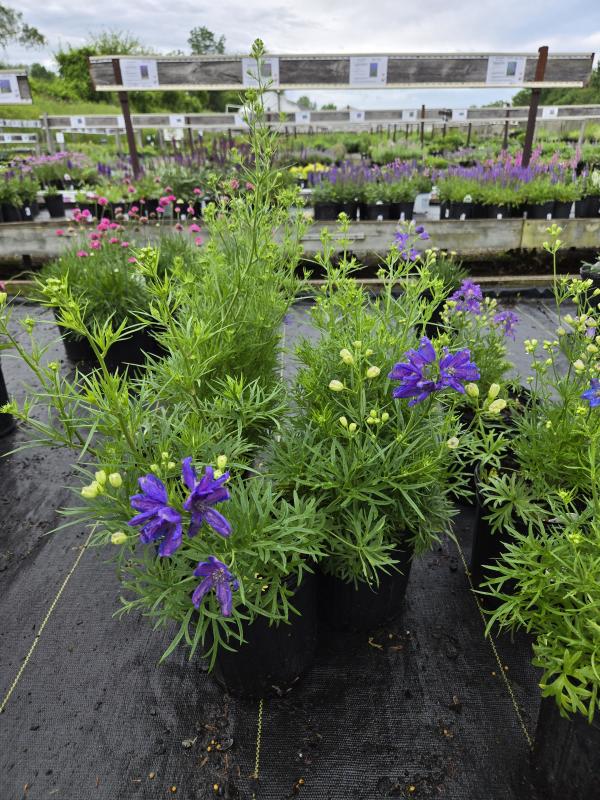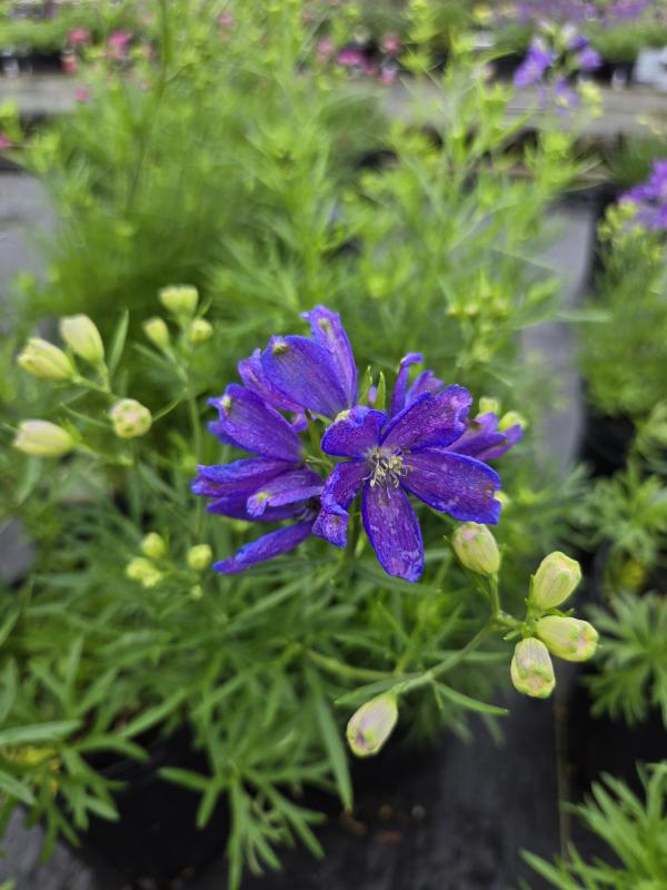 Freely branched, bushy plants with finely cut deep green leaves. Blooms all summer if deadheaded. Long lasting cut flower.  Very hardy. Toxic to pets. Brilliant gentian blue airy sprays. Much shorter than traditional delphiniums. Sunny location with rich moist soil. Heavy feeders.  Need basic soil, add lime if your soil is acidic.  Zone 2-9.