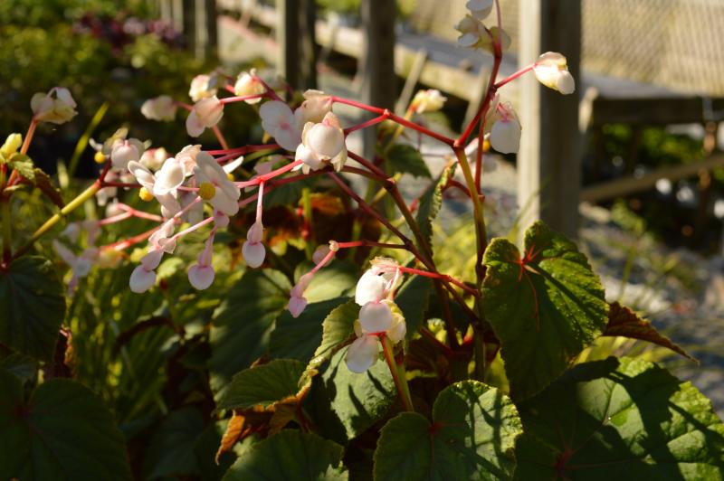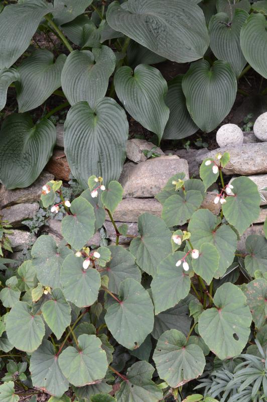 Hardy plant produced from tubers. Large fleshy pale green heart shaped leaves, red underneath. Plants have white arching sprays with reddish buds and white drooping flowers. Partial to fairly deep shade in humus rich, moist, but well drained soil.  Plant will self-seed.   Zone: 6 to 9.   Tolerates heavy shade and Black Walnut. Good shade border plant or unusual addition to dappled shade of a woodland or shady hillside garden. It’s late to appear making this a great follow up plant for bulbs that go dormant or dicentra spectabilis and Virginia bluebells.