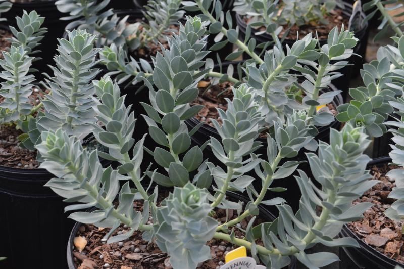 One of our favorite plants. Succulent blue-green leaves on thick stems. Has a tendency to creep rather than stand erect or clump. Has bright yellow flowers. Does best in well drained, average to rich soils in sun or partial shade, very drought tolerant. Zone 5-9. Use in front of a border, in rock gardens. Does well when planted with dwarf conifers, dianthus, mountain pink, rock cress, and sedums.