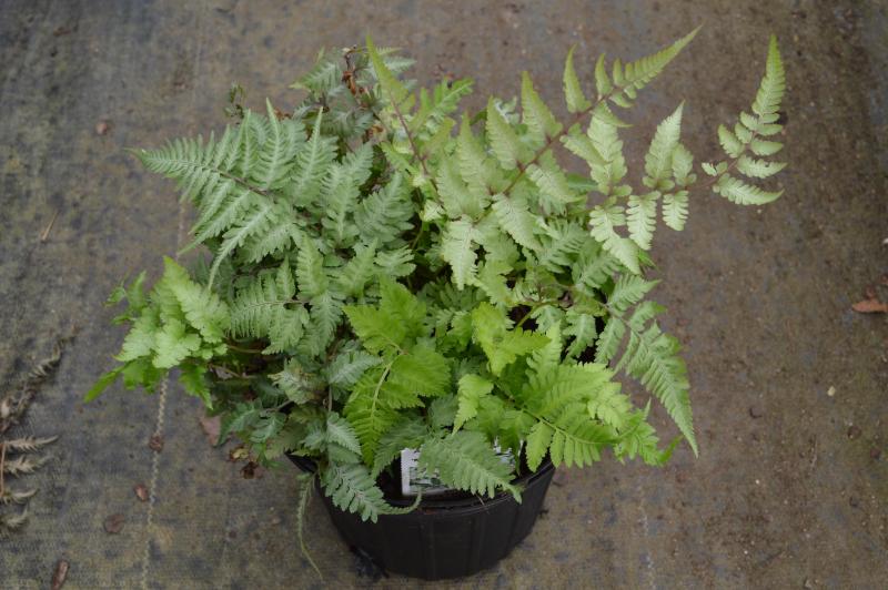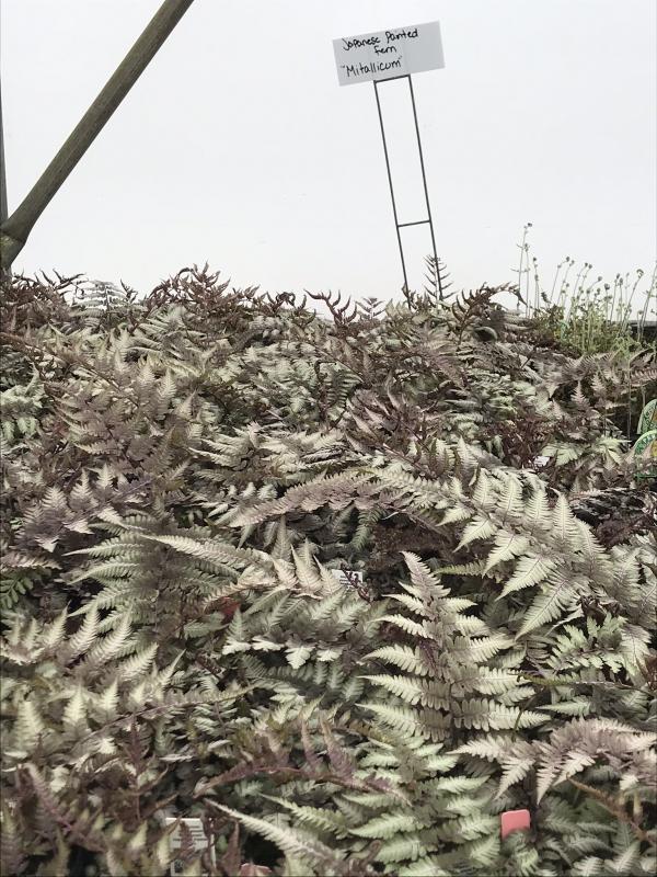 One of the most colorful ferns for the garden, this plant has silvery-grey fronds which are dusty purple towards the center.  They are set off by the purplish-red veins and stems.  Grows best in moist soil in light to partial shade.  Some sunlight is necessary to produce the vibrant coloring.    Zone 4-8. Combines well with colorful heuchera, other ferns, hostas, campanula, and columbines. Deer and rabbit resistant.