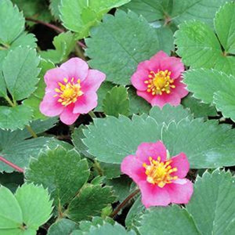 Everblooming strawberry plant with low and compact deep green foliage that forms neat mats. Spreads by runners to make a great groundcover. Does best in full sun in well drained soil. Zone 3-8. Use as groundcover in sunny areas and banks. Will hang down over a sunny wall and spill out of containers and strawberry jars.