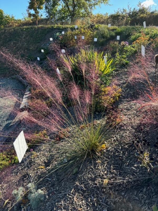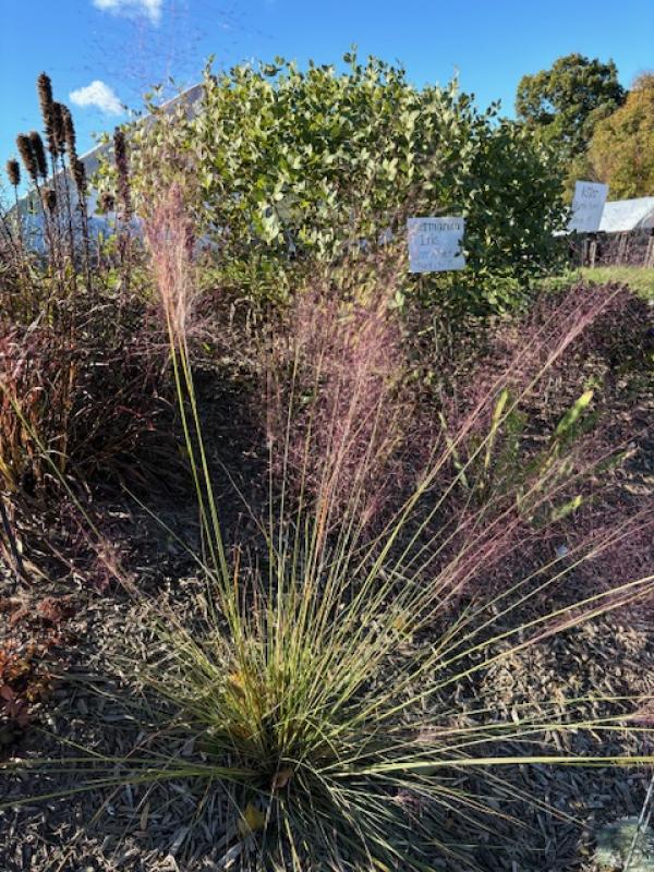 Native grass from US southwest. Plant with slender foliage that is nondescript until fall bloom of pink airy flowers. Best in sunny, dry, sandy soil. Will tolerate light shade. Literature is conflicting as to whether we are on the northern edge of its hardiness. Zone 6-9. Best massed to enjoy late summer show. Other dry sun loving plants for spring and early summer effect while you wait.
