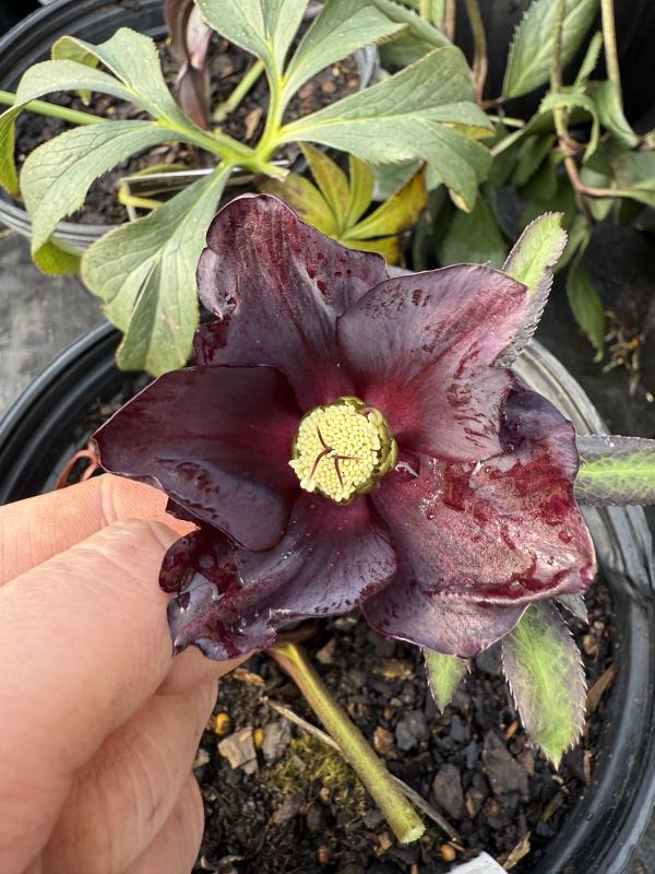 Bushy clumps of thick, leathery evergreen leaves.  Site these where they will stay for many years, since the plants resent being disturbed.  Trim the old leaves to the ground in late winter to give the flowers maximum impact. Flower stalks bear showy cup-shaped blooms with a single flower in shades of deep, grey-purple, black to purple-black. Evenly moist, humus rich soil in light to full shade.     Hardy to Zone 5 or colder. Plant with ferns, hosta, lungwort, tiarella, crested iris, cyclamen, and sweet woodruff. Deer and Rabbit Resistant. CAUTION:  Harmful if eaten/Skin irritant.