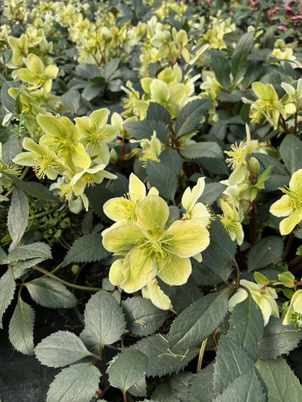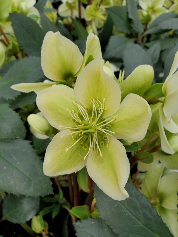 A interesting hybrid from Honeyhill Farms. Plants form a low evergreen clump of shiny blue-tinged leaves. A hybrid of H. niger and H. argutifolius. Beautiful 2 1/2 inch, white, cup shaped flowers with large centers of gold tipped stamens. Shade to partial shade in alkaline soil. Do not fertilize in summer during their resting period, mulch and fertilize in fall for best bud count in spring. Deer resistant. Plant in shady borders or light woodlands. CAUTION - harmful if eaten/Skin irritant.