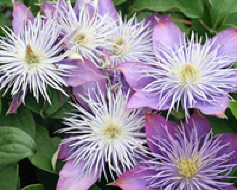 A most unusual clematis, this vine produces large violet-blue flowers that feature pink-blue-violet outer petals and long inner pale purple petals that appear like an exploding star! Can be trained to climb on walls or trellises, or can sprawl as a ground cover.