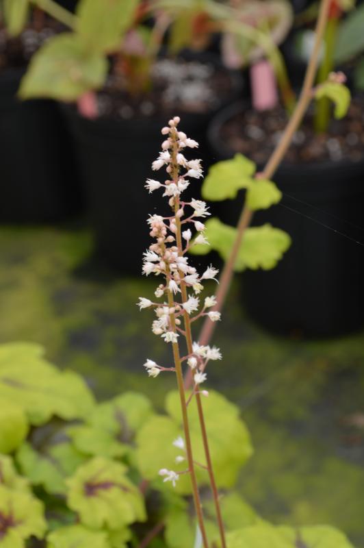 This bright colored foliage plant has vibrant lime green leaves that are rounded. In the middle of each leaf there are flame-shaped markings that flare out. Polished and vigorous. Evergreen. Happiest in moist well drained soil. Plant in an area with filtered sun or afternoon shade. ‘Catching Fire’ is a H villosa hybrid which means that it is more heat and humidity tolerant than Heucherellas without this parentage. Zone 4-9. Plant in combination with ferns, carex, polemonium, and hosta. Good plants for their varied foliage color. Invaluable plants for rockeries, front of borders, and as a groundcover under trees and shrubs. Most effective when planted in large groups. Plant as groundcover under decidous trees and shrubs.