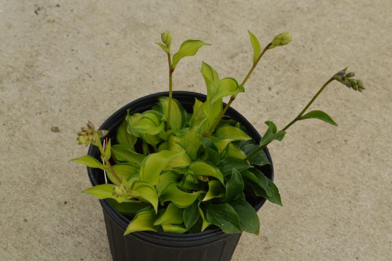 A small rock garden hosta with bright yellow angular foliage.  Darker green margins.  Cute and little with flowers on short scapes. Great container hosta. Sport of ‘Shiny Penny’. Easy to grow, long-lived plants. They perform best in a shady spot with evenly moist soil, but will do well in a shady dry spot if well mulched. Miniature hostas perform well in mixed containers.  Zone 3-9. Mini and small hostas are perfect as border plants along paths or when you need to fill a small space in the shade garden. They thrive in dry shade even in competition with tree roots. Great plants for troughs and patio containers placed in shady areas.