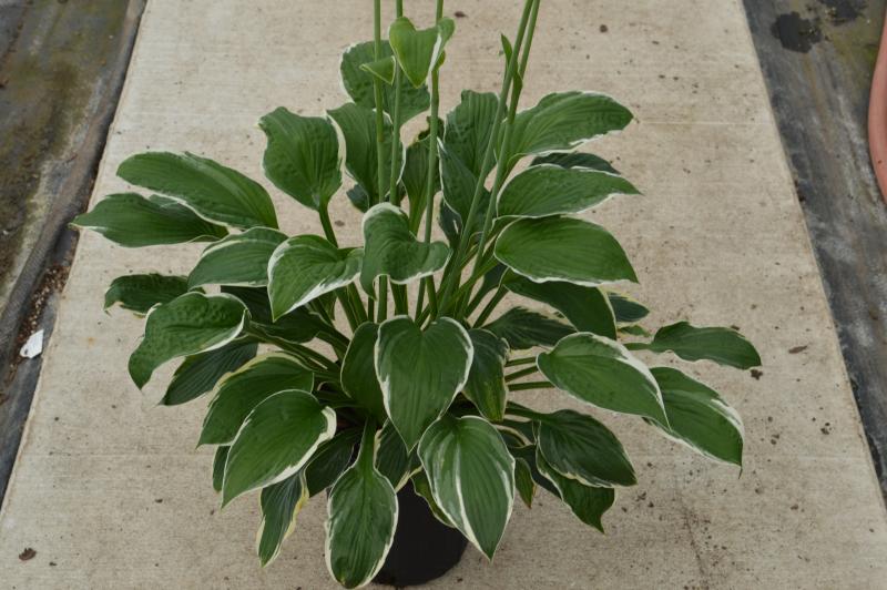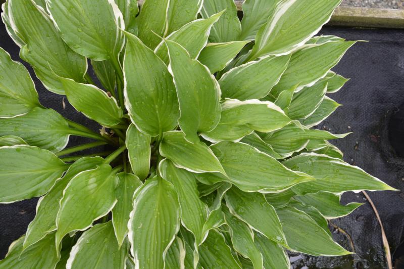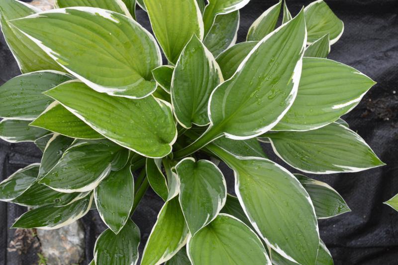 Large smooth leaves with white margins and deep green centers. Medium to fast grower. Hostas emerge late in the spring. Prefers evenly moist humus rich soil in part or full shade. Afternoon sun and high heat will bleach or burn many variegated or blue varieties.