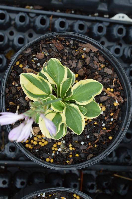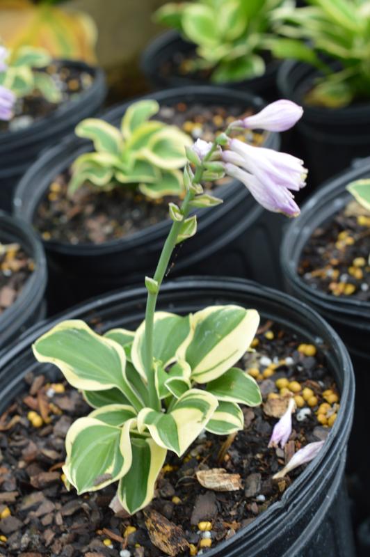A  small, mound forming variety featuring thick, wavy, blue/green foliage with a creamy yellow margin in the spring. In the summer, the center turns greener and the margin fades to a creamy white. Blooms pale lavender flowers in early summer. Easy to grow in part sun to full shade, in rich, moist soil. Zone 3-9.