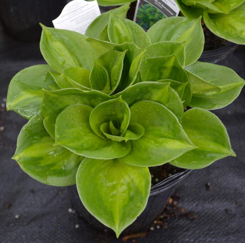 Small hosta grows quickly to form a compact clump of thick, rugose, distinctly cupped leaves that are yellow with broad, deep margins at maturity. The centers of the leaves are chartreuse in spring and brighten as the season progresses. Long lived plants. Grow best in rich, moist, but well-drained soil in filtered sunlight. Mixing an abundance of organic matter into the soil when planting and then mulching over the years keeps hostas looking their best. Water during periods of drought and protect from slugs. Zone 3-8.