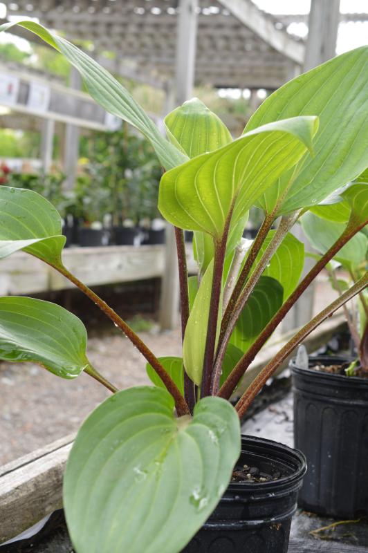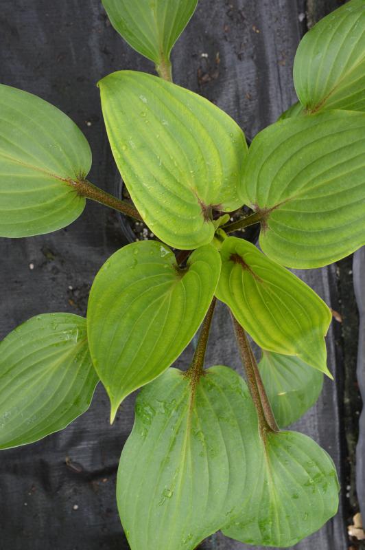 Glossy lime to green leaves spotlighted with red purple in the leaf base. One of the most neat and uniform habits of any Hosta. The short petioles are almost black. A compact, densely clumping habit. Good slug resistance. Long lived plants. Grow best in rich, moist, but well-drained soil in filtered sunlight. Mixing an abundance of organic matter into the soil when planting and then mulching over the years keeps hostas looking their best. Water during periods of drought and protect from slugs. Zone 3-8.