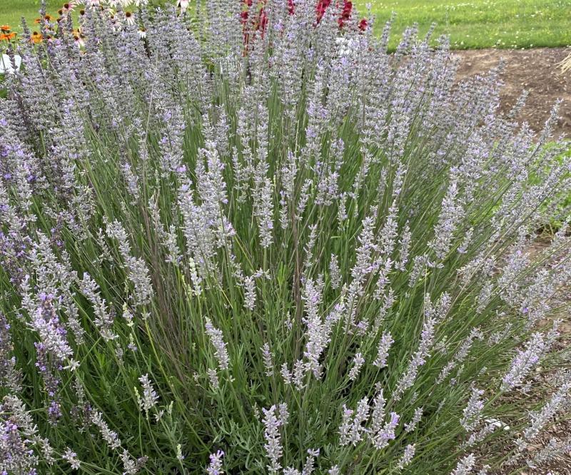 Bushy, distinctively scented, dense silvery-green foliage that holds up well in cool, wet weather. Dark purple flower spikes stand out against its foliage and have a strong lavender scent. Average to rich, well drained soil in full sun. Established plants are drought tolerant and deer resistant. Prune back or divide to encourage new growth. Zone 4-9. Makes a splendid low hedge or specimen plant. A must in the herb and dried flower garden. Plant in sunny borders with yarrow, daylilies, dianthus, oenothera, sea holly, and rock cress.