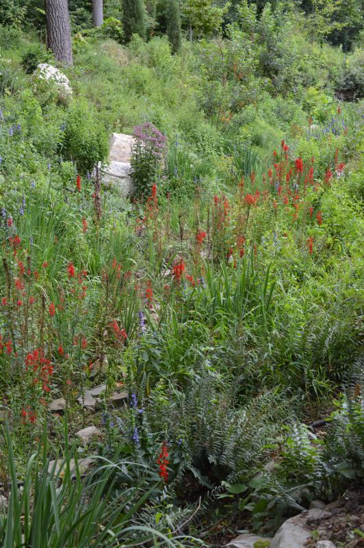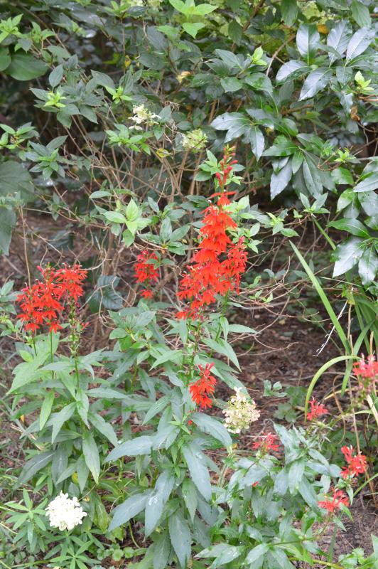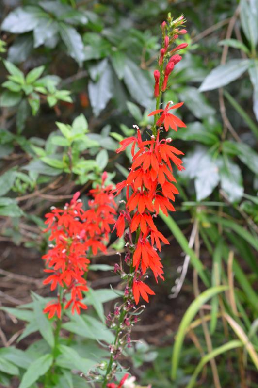 Erect spikes of red flowers and lance shaped green leaves. Grow from a rosette of leaves that often remain green all winter. Attracts hummingbirds. Plant along streams, ponds, or moist woods. Prefer rich, constantly moist soil in light to partial shade. Plants short lived, but self-seed if not heavily mulched. Zone 3-9
