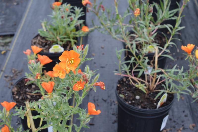 Drought tolerant plant. An unusual evening primrose with whorls of vivid yellow orange, papery flowers that fade to maroon red, on a well branched red stemmed plant with rich green foliage. Likes average dry, well drained soil in full sun. Will reseed. Plant in sunny border, cottage garden or wildflower garden with nepeta, lavender, blue flax, daisies, feverfew, belamcanda, bearded iris, and garden phlox.