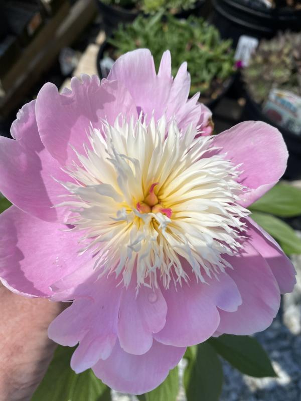Herbaceous, bushy plant produces ruby red shoots that open into mounds of divided foliage. Large tight rounded buds open into large showy flowers. Great fragrant cutflower. Sunny location in loamy well drained site. Do not over fertilize with nitrogen. Interplant with spring flowering bulbs so expanding peony foliage will shroud declining bulb foliage. Can use peonies as a herbaceous hedge or interplant in sunny border or cut flower garden.
