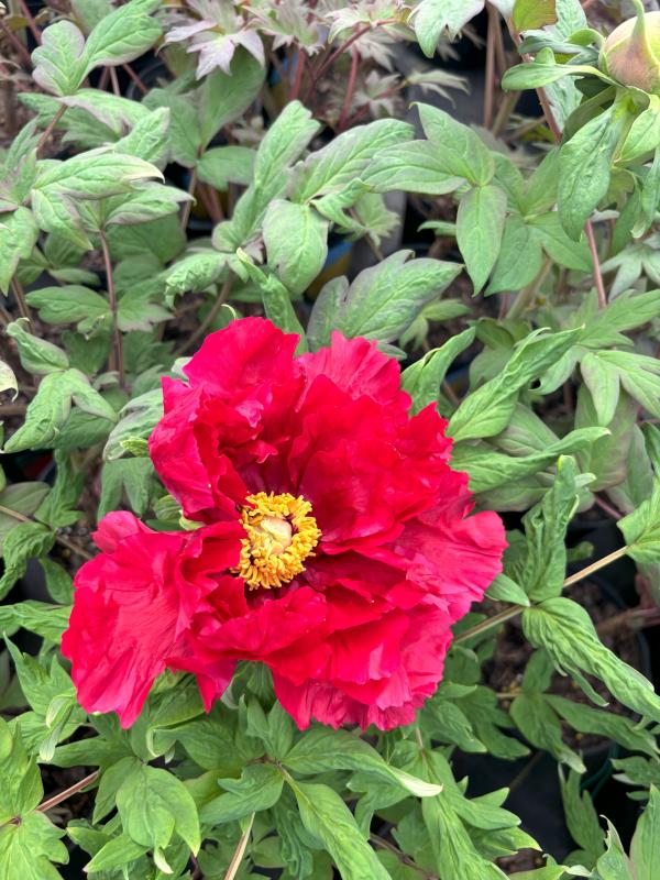Easy to grow shrubs with woody, sparsely branching stems that grow from thick roots. Large leaves and flowers are produced each season on new growth. Semi-double red blossoms that produce a delightful fragrance. Plant in well-prepared, slightly acid, humus rich, soil in full sun or light shade. Plants are often grafted, plant with graft 6-12 inches below the soil. Plant tree peonies in a shrub border, or plant with fine-textured flowering plants. Great accent shrub in island border.