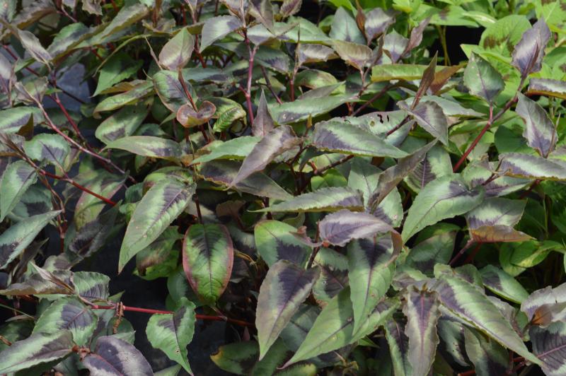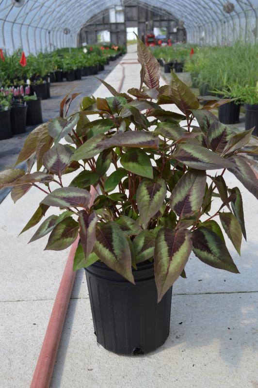 Dark and dramatic, unique specimen plant. Dark purplish leaf centers give way to a light chevron and a darker green border. Does best in part sun to part shade in average to dry soil. Mounding, spreading, dark foliage contrast plant to mix in with other greens in borders. Plant on lightly shaded banks or among trees and shrubs.