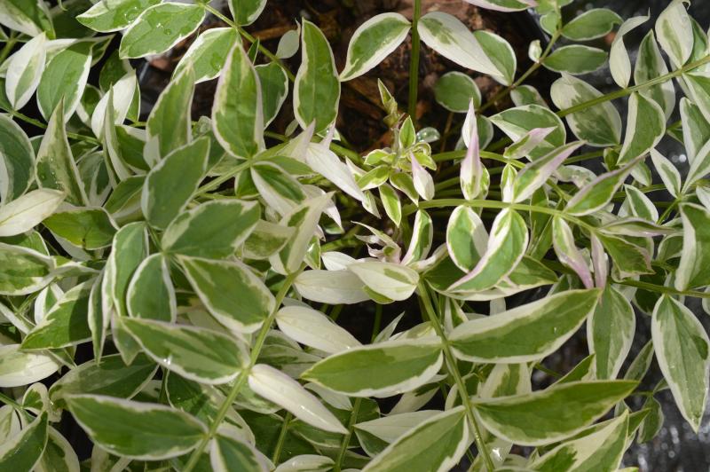 A variegated jacob's ladder with white variegation surrounding large green leaflets with pink flushes. Clusters of pink buds open to blue, cup shaped flowers in April to July. Plant in rich, well drained soil in part shade to part sun. Deer resistant. Zone 3-7.