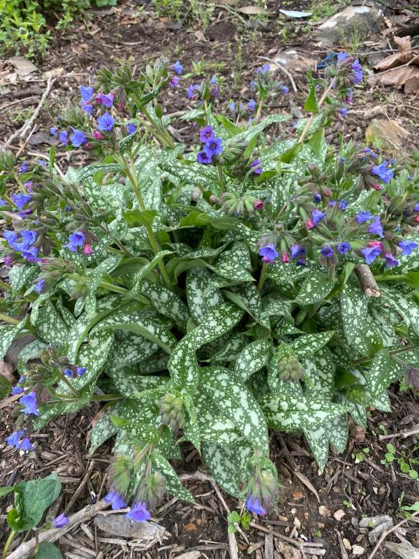 Combination of early large cobalt blue blooms and attractive foliage all season makes this a popular shade groundcover or specimen plant. Brightly silver spotted dark green leaves stay fresh all summer. Easy to grow in evenly moist, humus rich soil in partial to full shade. Plants are drought tolerant once established but may go dormant early if it gets too dry. Lovely spring flowers emerge with spring bulbs and are followed by fancy foliage for a tough summer shade groundcover. Plant under trees and shrubs or along a shady path with hellebores, bleeding hearts, iris cristata, and columbine.