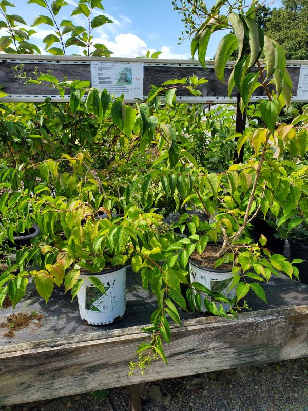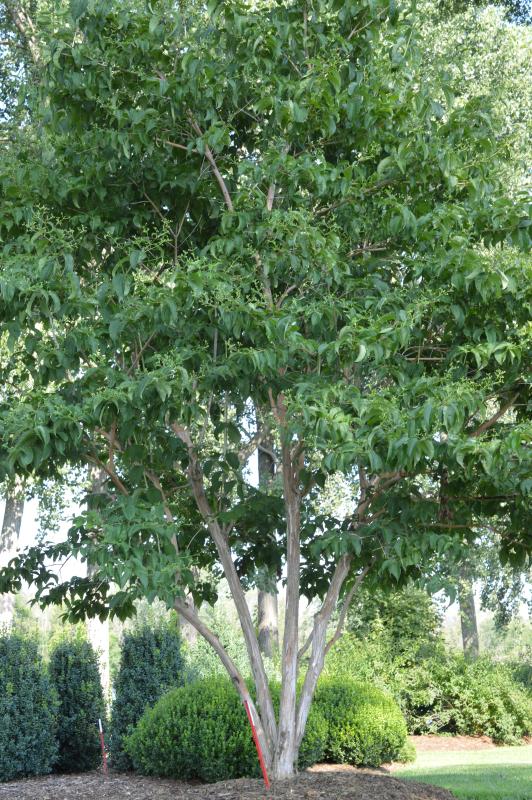 This tall arching multi-stemmed shrub with attractive peeling bark grows rapidly. Come late summer it fills your space with ornamental fragrant white flowers on seven tiered panicles. Then, after those flowers drop in early fall, what remains are the stunning red sepals and showy purple/red berries.