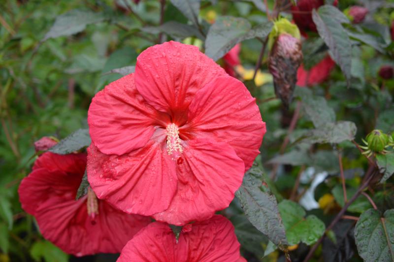 With itβs combination of deep dark-green Maple-like leaves and large dark fuchsia blooms covering the plant top to bottom, this mallow is a stunner from summer to fall. They emerge later in the spring than most shrubs, however they are fast growing. Because they tolerate boggy soils, Hibiscus mosheutos are great zone 1 rain garden options as they handled standing water for a period of time.