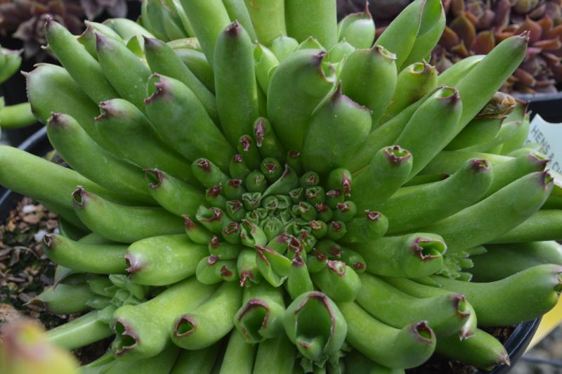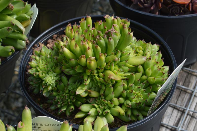 Eye -catching apple-green succulent with round rosettes up to 6 inches wide that spread by “hatching” smaller rosettes (chicks) from the main plant (hens). Bizarre selection with leaves rolled into a tube. Plant in full sun in a wide variety of soils, even pure sand, but they must have good drainage. Like it hot and dry. Excellent grown in rock gardens, miniature gardens, porch boxes, garden vases, strawberry jars, dry stone walls, and between paving stones.