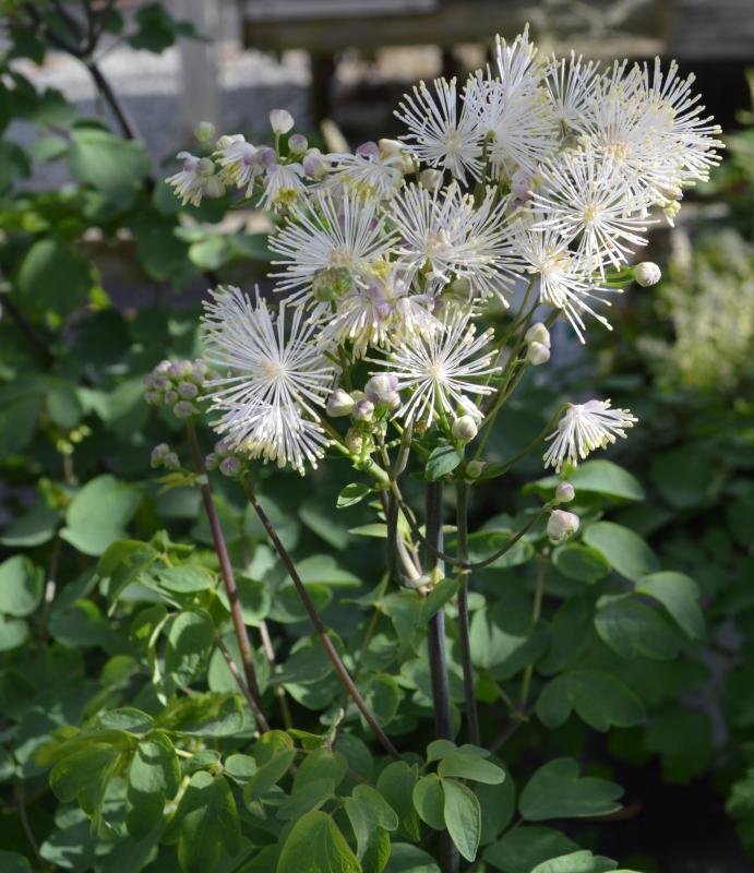 ‘Nimbus White’ has dark stems and fern-like leaves. A compact habit with many stems show off with a huge inflorescence of blooms. Blooms the first year. Leaf color is dark green, almost black. Plant in rich, moist, but well drained soil in partial shade. Clumps may be divided every 3 to 4 years if desired. Cut back to the ground in late autumn. Great specimen plant in the landscape, both flowers and foliage are beautiful and bold. Excellent plant for back of border, ponds edge, or woods edge.