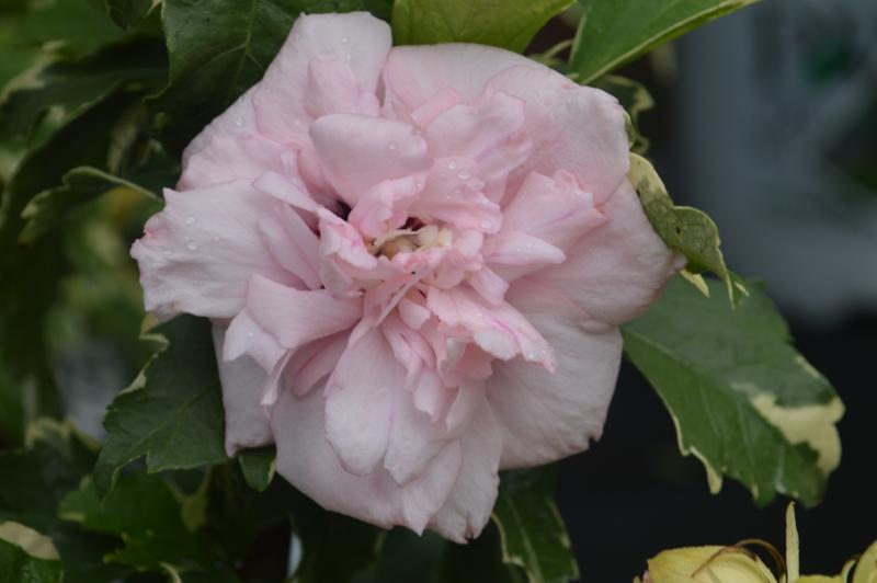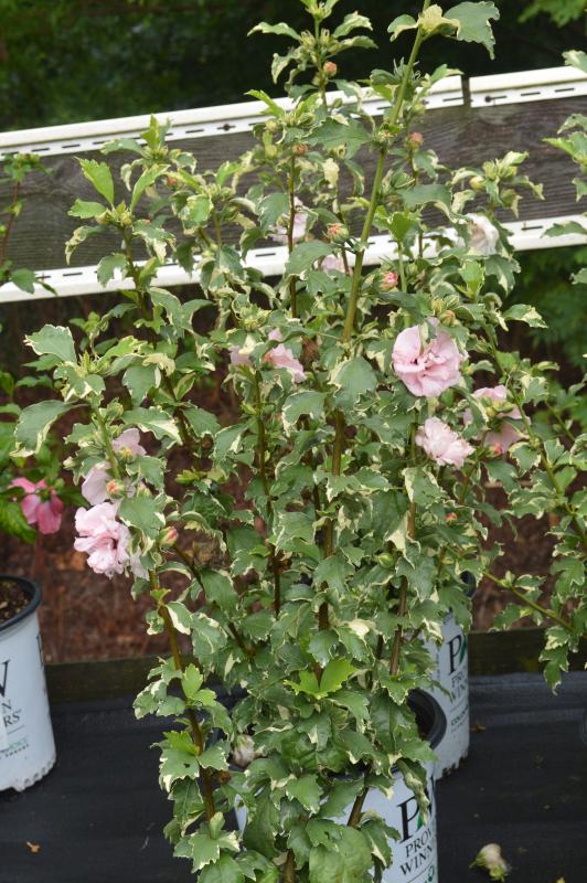 'Sugar Tip' is a semi-dwarf Rose of Sharon with variegated cream and green leaves below double, pale pink, seedless flowers. Works well in the landscape as a hedge or scree, in perennial or shrub boarders, as a specimen, and can be planted in containers and moved inside or can be planted in fall.