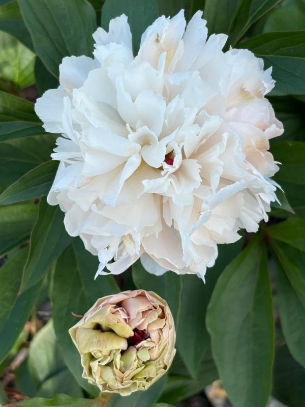 Long lived, hardy, herbaceous, bush like perennial with divided leaves that are maroon in spring and turn green. Plants bear hugh fragrant flowers that are a good summer cut flower. Not particular about soil.  Grow in full sun or light shade for best flower production. Mulch to keep roots cool and moist. Do not over fertilize, leaf spots can be a problem if plants have too much nitrogen. Plant peonies in a row for a hedge or plant in sunny border. Plant with spring bulbs and their expanding foliage will shroud declining bulb foliage. Plant with Siberian iris, foxgloves, poppies, salvia, dianthus, rudbeckia, and daisies.