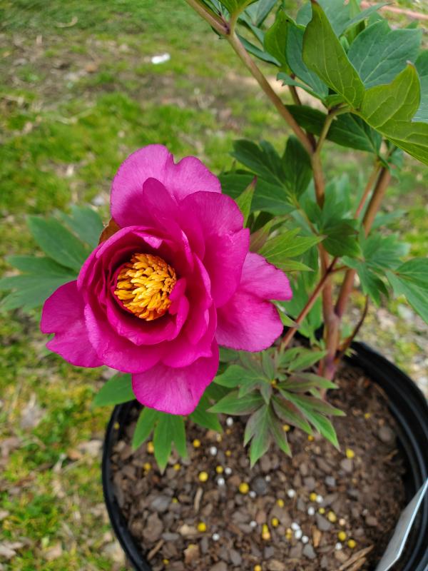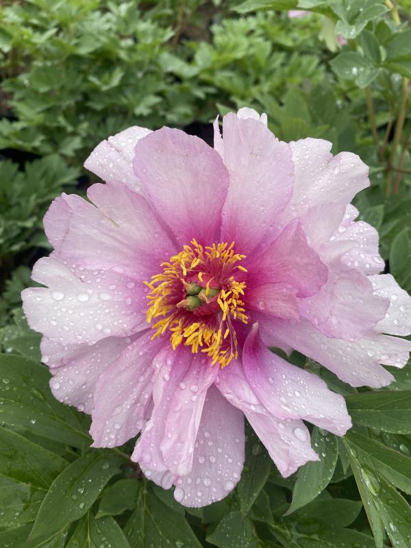 A cross between herbaceous garden peonies and woody tree peonies. Plant forms a sturdy clump of foliage 25-30â tall and wide that looks great spring through fall. Strong stems hold flowers upright even after heavy rain. Not particular about soil. Grow in full sun or light shade for best flower production. Mulch to keep roots cool and moist. Do not over fertilize. Leaf spots can be a problem if plants have too much nitrogen. Plant peonies in a row for a hedge or plant in sunny border. Plant with spring bulbs and their expanding foliage will shroud declining bulb foliage. Plant with Siberian iris, foxgloves, poppies, salvia, dianthus, rudbeckia, and daisies.